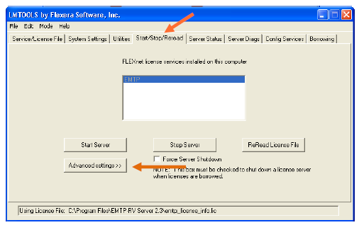 9. Place the license file emtp_server_license.lic in the EMTP License Server folder, i.e. the same folder as the “lmgrd.exe” application (by default: C:Program FilesEMTP License Server) and start again the FLEXlm License Manager Utility.