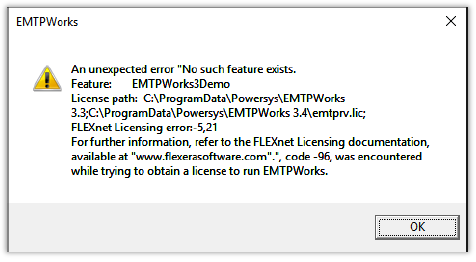 When opening EMTP-RV on the client machine, the following error message pops up: